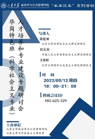 2022年5月12日晚,澳门网投官方网站、澳门网投官方网站当代社会主义研究所召开华岗特色班(科学社会主义专业)人才培养和专业建设专题研讨会。会议由澳门网投官方网站副院长赵婷主持,北京大学世界社会主义研究所所长项佐涛老师、中国人民大学世界社会主义研究所所长郑云天老师和北京大学国外马克思主义研究所研究员王聪聪老师作为与谈人,澳门网投官方网站华岗特色班(科学社会主义专业)的本科生参与此次研讨会。