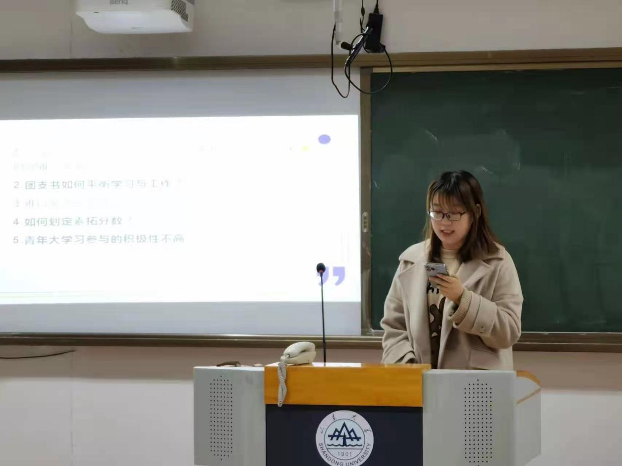 接着,学院学生会团支部服务中心部长姜天资就团支部建设过程中出现的问题进行了讲解,就与会各团支部委员关心的青年大学习活动开展、提高主题团日活动参与的积极性、如何平衡学习与工作等问题进行了一一解答,并对各团支部委员接下来有序开展团支部工作提出了期待。