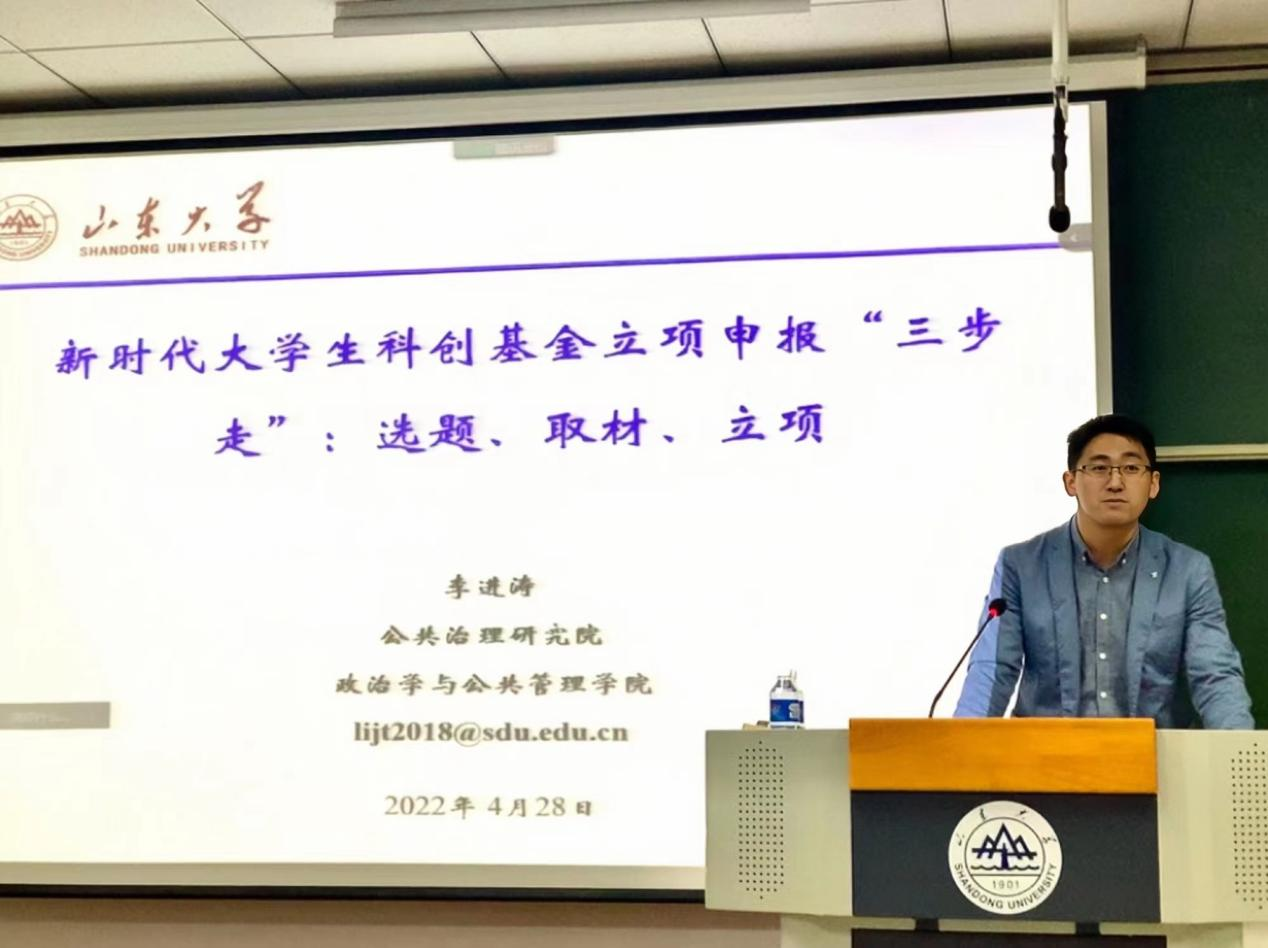 4月28日晚,由澳门网投官方网站团委主办、学院学生会学术部承办的科创基金项目指导讲座于振声苑顺利举办。澳门网投官方网站公共治理研究院副教授、硕士生导师李进涛受邀出席并担任主讲嘉宾。