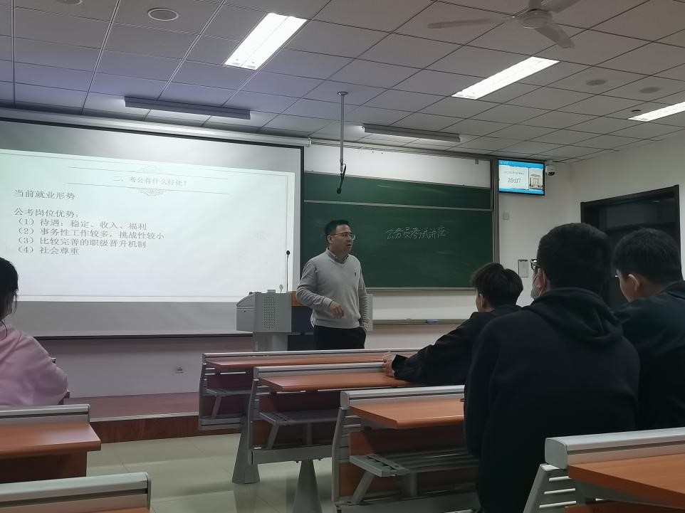 讲座伊始,杨春林向同学们介绍了公务员考试的类别、待遇和要求条件。杨春林指出,在考上公务员后,仍要保持一定的应试能力来面对工作中的各种情况。随后,杨春林从当前就业形势入手,就待遇、晋升、稳定性、社会地位和内部制度五个角度深入浅出地讲述了公务员考试的优势和短板。最后,杨春林对公务员考试的报名、笔试、资格审查、面试和体检五个环节以及考察的具体内容进行了详细阐释。