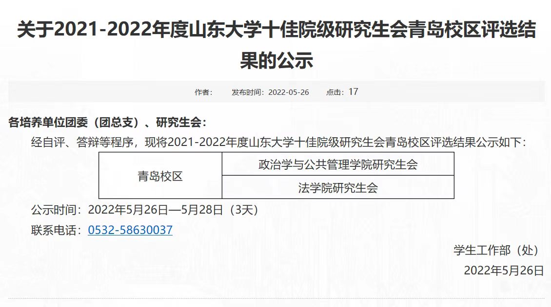 5月25日,澳门网投官方网站(青岛)“十佳院级研究生会”答辩会于线上举行。澳门网投官方网站研究生会凭借卓有成效的扎实工作和各部门的通力合作,最终以青岛校区第一名的成绩荣获2021-2022年度“澳门网投官方网站十佳院级研究生会”荣誉称号。我院研会已连续三年获此殊荣。