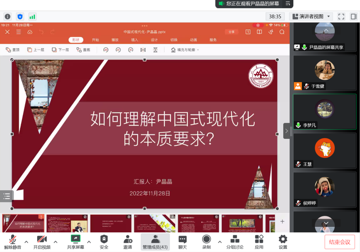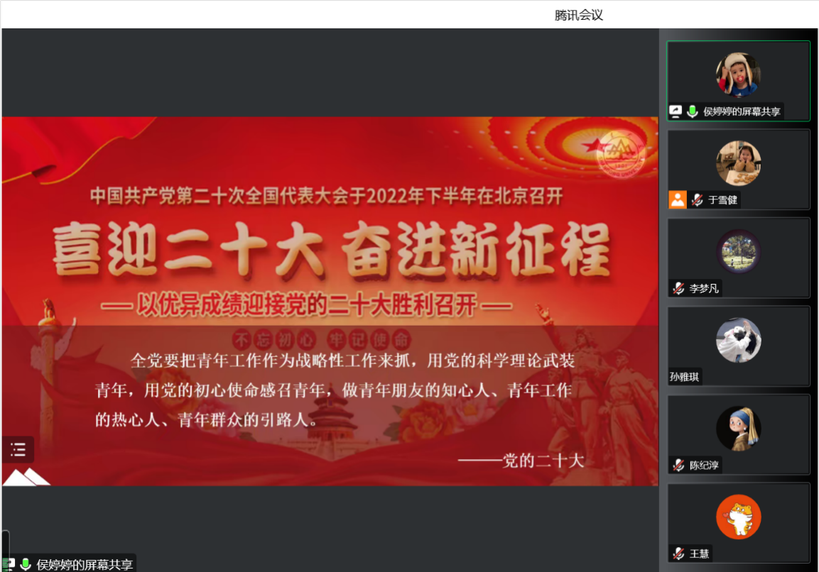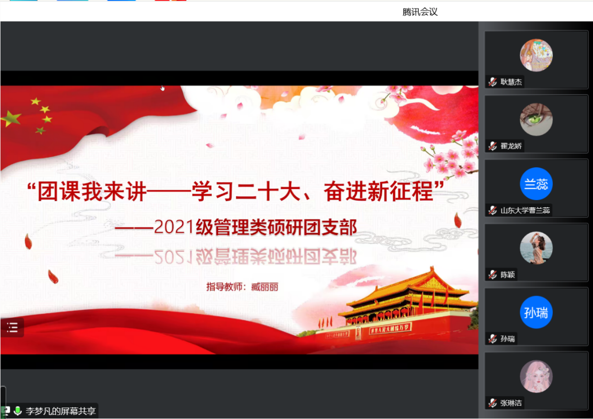 为深入学习宣传贯彻党的二十大精神,提高同学们的思想政治素质和政策理论水平,进一步坚定跟党走中国特色社会主义路的信念,澳门网投2021级管理类硕研团支部于11月28日通过线上方式举办了“团课我来讲——学习二十大、奋进新征程”主题团日活动,支部全体团员到场参与学习。