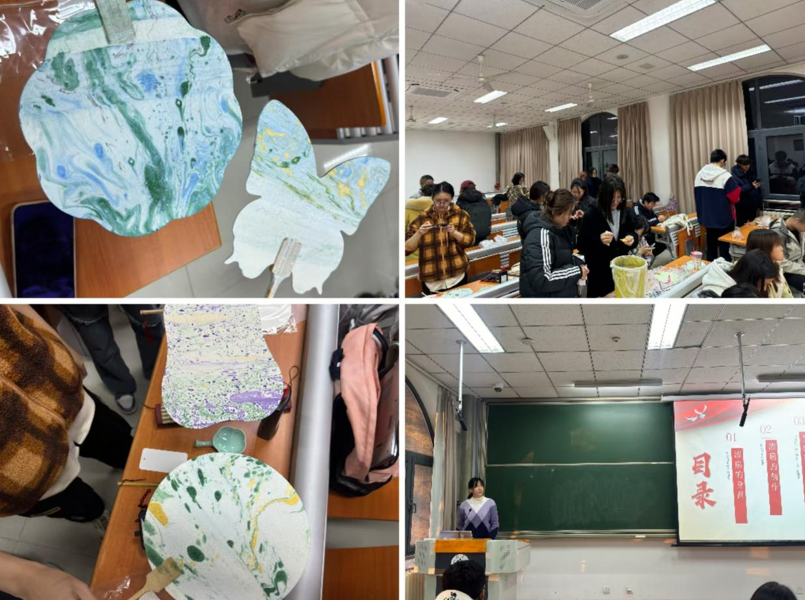 在理论学习之后,进入了大家期待已久的实践操作环节。同学们分成小组,进行现场制作。制作开始之前每个组都在桌面上铺好了一次性桌布,既方便同学们摆放材料,又能保持桌面的整洁美丽。大家在组内成员的互相帮助下,体验了漆扇的制作过程。尽管过程中遇到了不少挑战,但大家都表现出了极大的热情和耐心,互相帮助,共同克服困难。经过一番努力,每个人都完成了一件独一无二的漆扇作品。看着自己亲手制作的作品,大家脸上洋溢着自豪和满足的笑容。制作环节完成后,团支部成员对教室进行了打扫,清理桌面以及收拾垃圾等工作,使教室保持干净整洁的状态。