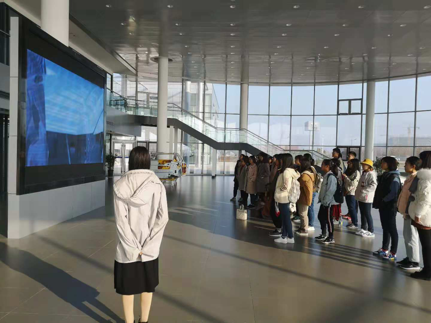 活动中,工作人员向老师和同学们展示了有关公司管理方式以及先进生产方式的视频。同学们由此产生了思考,并积极就相关内容与工作人员交流。之后,老师和同学们乘坐电瓶车进厂房参观,听讲解员介绍生产线及先进设备。同学们深感管理管理之先进,科技发展之迅速。