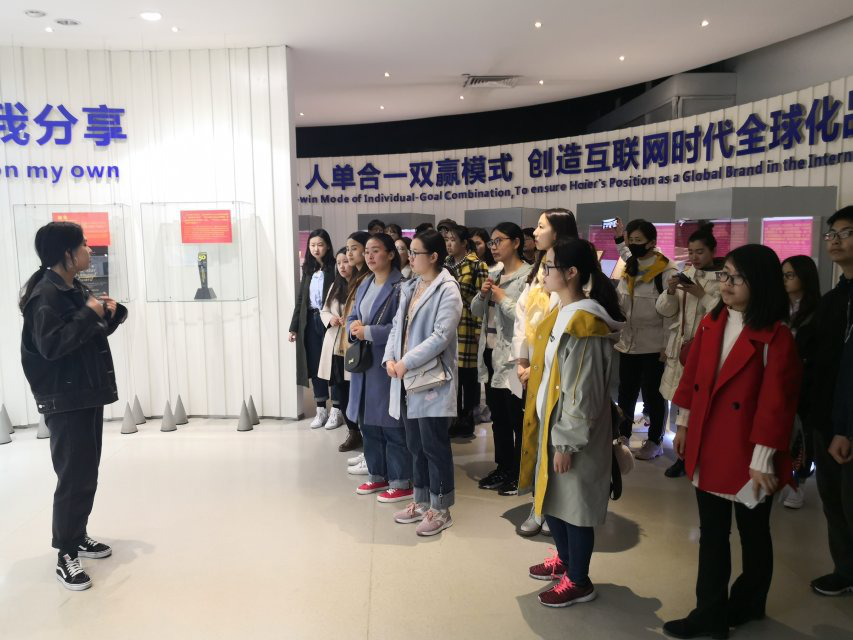 “海尔文化馆”向同学们展示了几十年来,一代代海尔人砥砺自我、做大做强的历程。其中,海尔的“人单合一”的管理模式——每个员工和他创造的成果价值相关联,没有明显的上下级关系,每个人都可以成为自己的CEO。这种独特企业管理模式也给同学们学习了解现代管理提供了鲜活的例证。