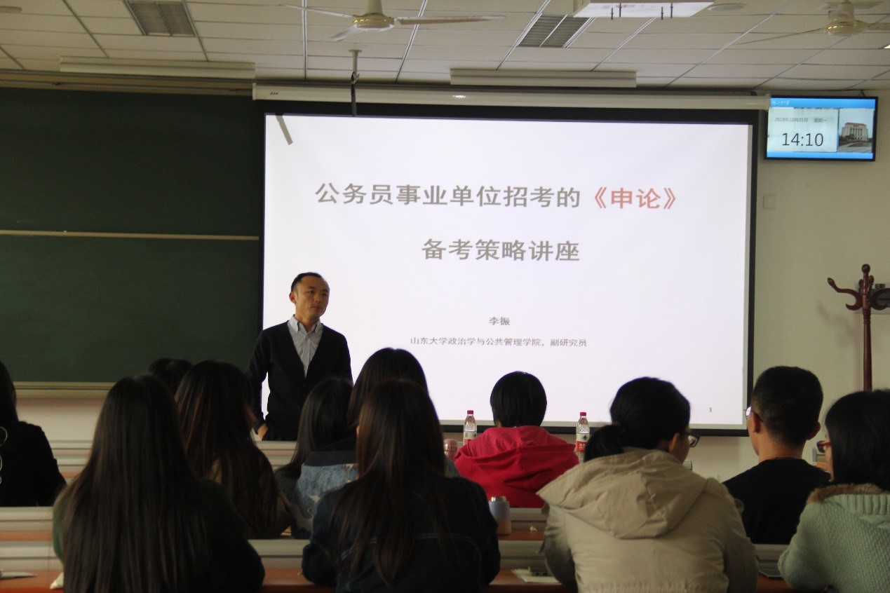 为提高同学们的《申论》写作水平,使同学们掌握有效的写作技巧,10月21日下午,澳门网投在振声苑S306教室举办公务员事业单位《申论》备考策略讲座。本次讲座由澳门网投、展翼助翔工作室主办,澳门网投研究生会承办。讲座特邀澳门网投副研究员李振老师担任主讲人,对公务员事业单位《申论》备考策略进行分析与讲解。