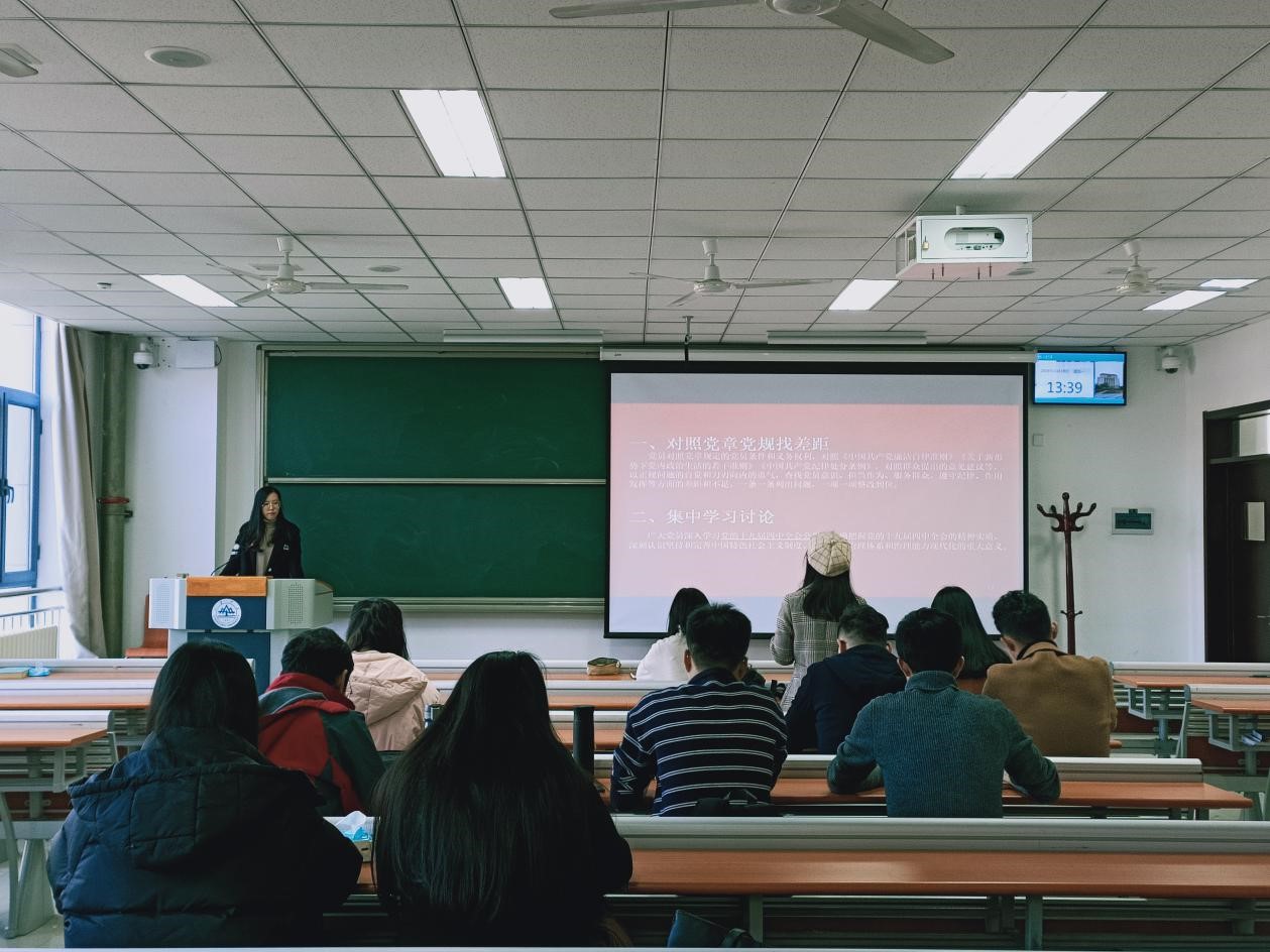 党史专业的杜一民和科社专业的刘彬两位同学分别从微观、宏观两个层面向大家分享其学习十九届四中全会公报的心得体会。支部成员就两位同学的发言展开交流讨论,大家一致认为,中国特色社会主义制度和国家治理体系是经过长期实践检验的符合中国国情的正确选择,必须倍加珍惜,作为青年党员,应当牢固树立“四个意识”,坚定“四个自信”,紧紧团结在党中央周围。