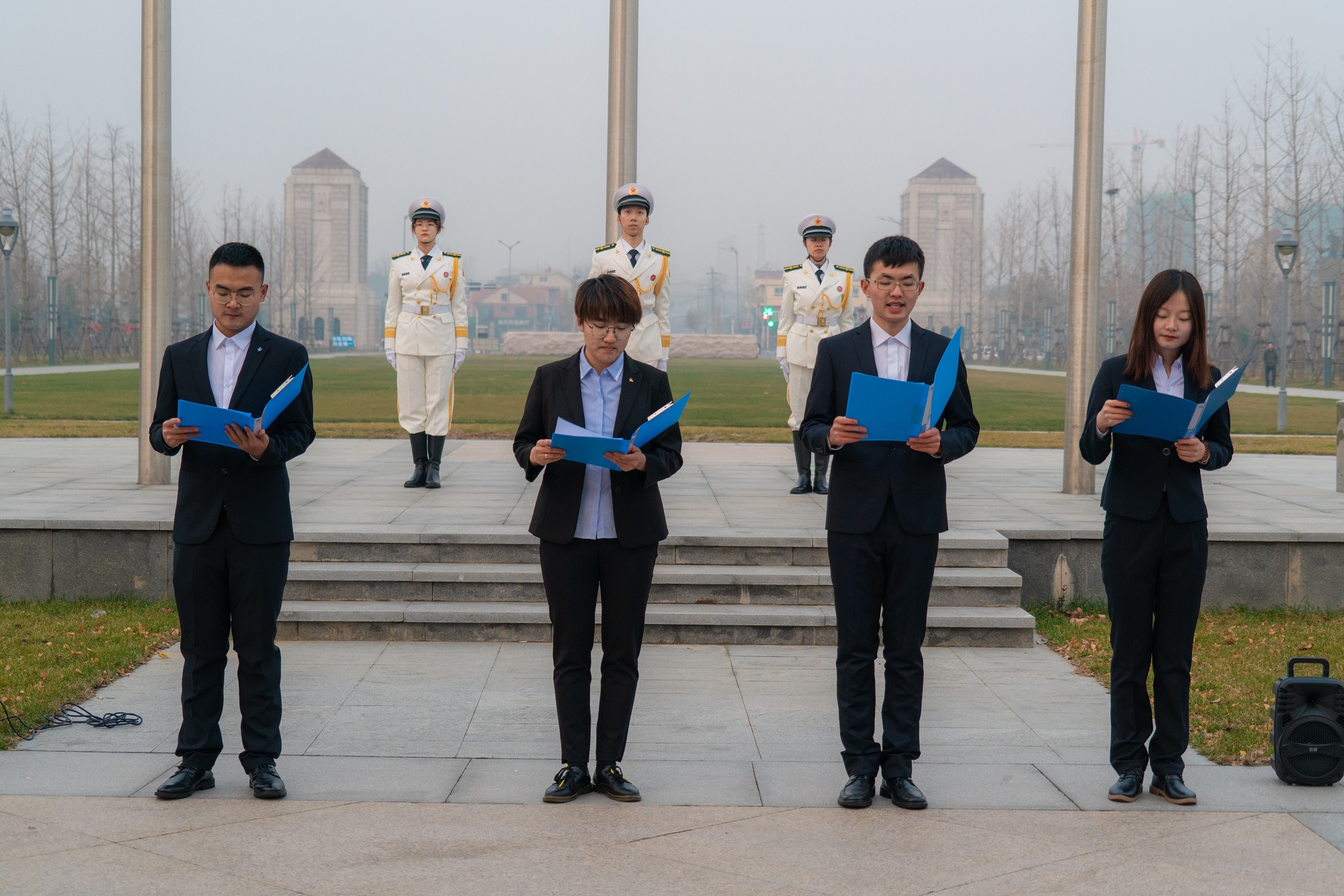 上午7点,青岛校区国旗班随着“出旗!”一声令下,迈着整齐的步伐护送国旗来到旗杆下,升国旗仪式在嘹亮的国歌声中正式开始。鲜艳的国旗缓缓升起,现场师生向国旗行注目礼,齐声高唱国歌,现场气氛肃穆而庄重。