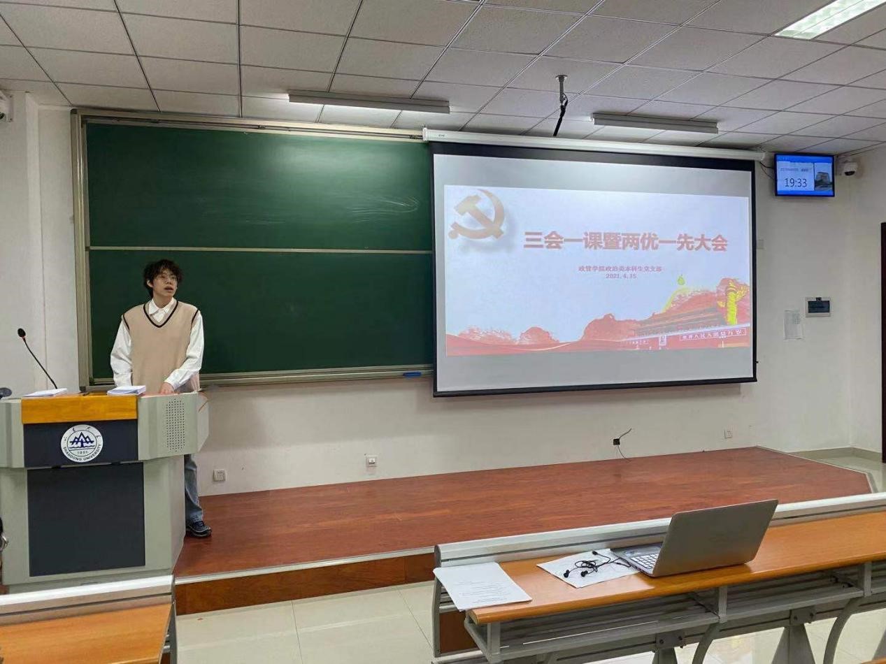 2021年4月15日,澳门网投政治类本科生党支部与管理类本科生党支部联合组织学生党员开展了三会一课暨两优一先大会。