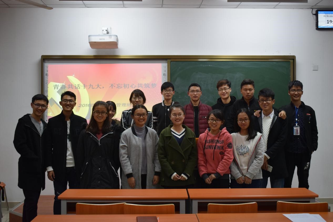 为提升班内学生的思想政治水平,树立奋斗目标,增强使命感和担当感,班委组织同学学习党的十九大精神,并举办了“青春共话十九大,不忘初心共筑梦”主题演讲,并组织同学们开展了两次“成才大讲堂”主题班会,共同观看电影《厉害了,我的国》,开展了庆祝改革开放四十周年主题团日活动和学习习近平总书记在五四运动一百周年大会上的重要讲话。