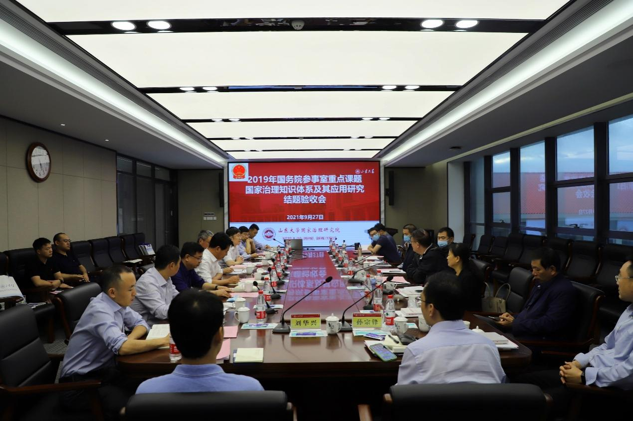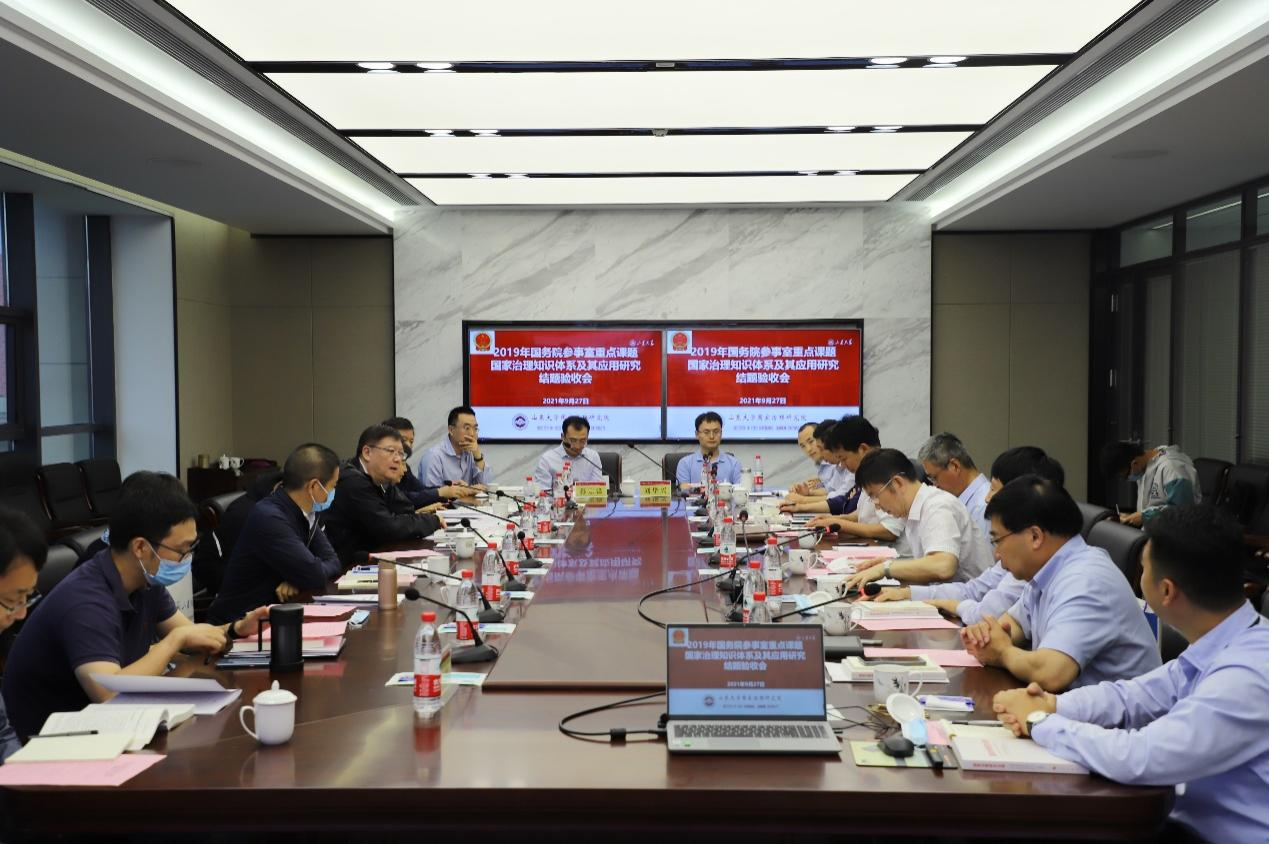 9月27日,2019年国务院参事室重点课题“国家治理知识体系及其应用研究”结题验收会暨澳门网投官方网站国家治理研究院工作座谈会在青岛校区华岗苑南楼五层中厅举行。国务院参事室特约研究员邱进(副部长级),参事业务二司司长孙维佳,参事业务二司调研处处长郭良玉,澳门网投官方网站党委常委、常务副校长王琪珑教授,评审专家山东省委党校科学社会主义教研部主任张传鹤教授,中国海洋大学国际事务与公共管理学院院长王琪教授,山东师范大学公共管理学院院长李松玉教授,课题组成员澳门网投官方网站青岛校区副校长、澳门网投官方网站常务副院长曹现强教授,党委书记盖玉强研究员,副院长马奔教授、刘昌明教授、李济时教授、孔新峰教授等专家学者出席会议。会议由澳门网投官方网站党委常委、副校长兼青岛校区校长韩圣浩教授主持。