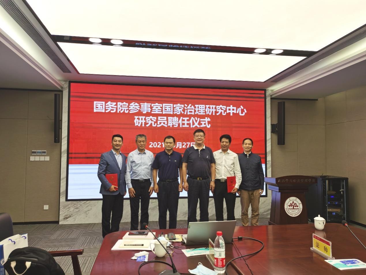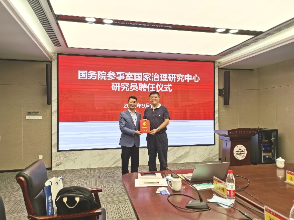最后,举行了国务院参事室国家治理研究中心研究员聘任仪式。曹现强教授、孔新峰教授受聘为国务院参事室国家治理研究中心研究员。