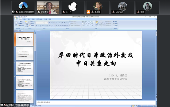 2022年4月16日晚,澳门网投官方网站和亚太研究所联合主办的“社科与人文”系列讲座第十讲在线上顺利举办,讲座题目为“岸田时代日本内政外交及中日关系走向”。本次讲座由中国社会科学院日本研究所所长、东海问题研究中心主任杨伯江研究员主讲,澳门网投官方网站亚太研究所所长杨鲁慧教授和副所长钟诚副教授共同主持了学术讲座,200余名师生在线参与。