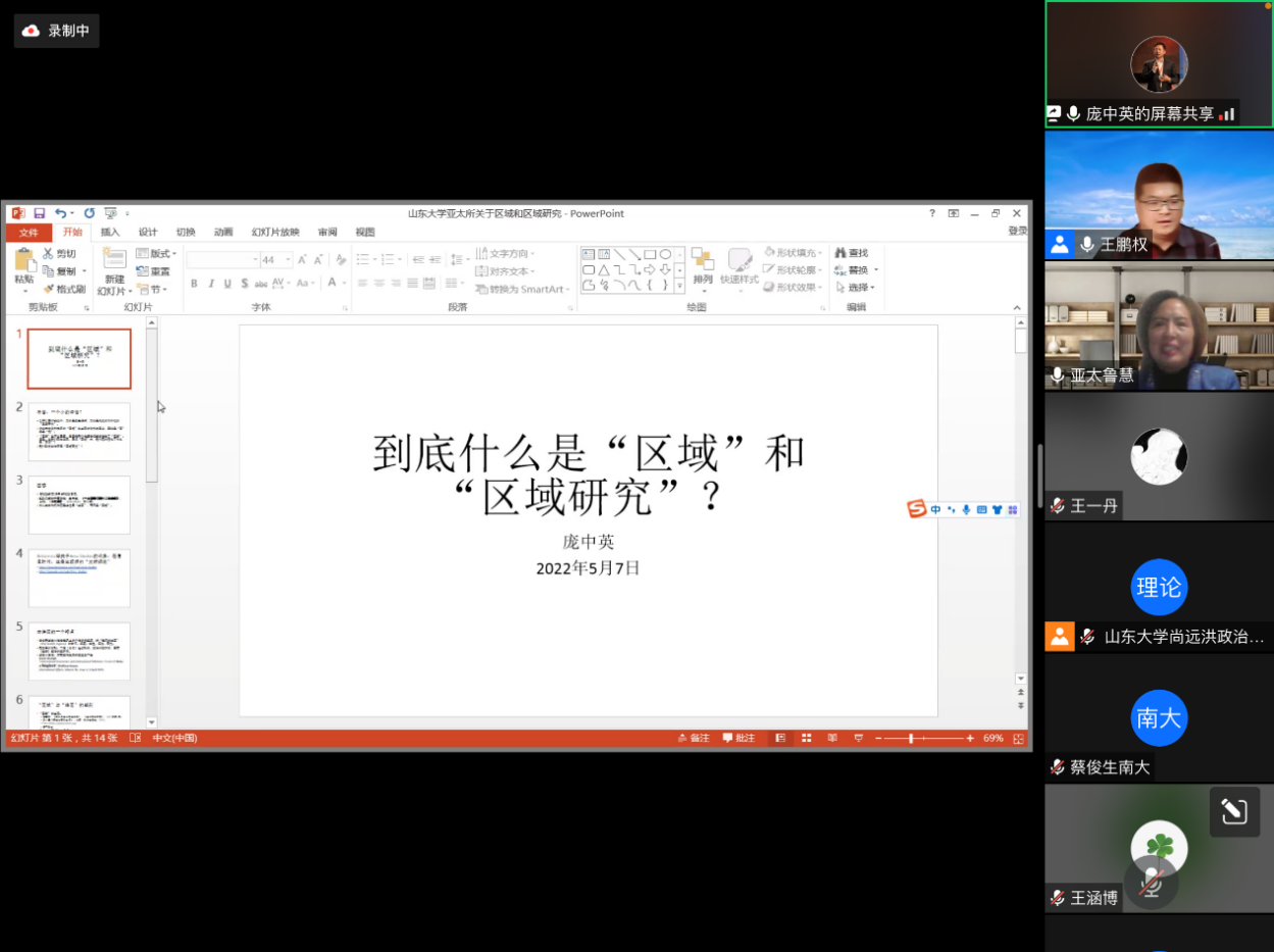 2022年5月7日晚,由澳门网投官方网站、亚太研究所联合主办,亚太研究所大国关系与地区安全研究中心承办的“社科与人文”系列讲座第十一讲在线上顺利举办,讲座题目为“到底什么是‘区域’和‘区域研究’”。本次讲座由中国海洋大学特聘教授、海洋发展研究院院长庞中英主讲,主持人为亚太研究所大国关系与地区安全研究中心主任王鹏权博士,亚太研究所副所长赵玙佳副教授、亚太研究所地区环境与中国周边外交研究中心主任李昕蕾教授担任与谈人。