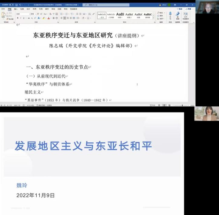 11月9日,《外交评论》执行主编陈志瑞教授、对外经贸大学国际关系学院魏玲教授做客“学术经验与谈”和“学术交流与指导”,澳门网投官方网站讲席教授、全球治理与国际组织研究中心主任秦亚青教授主持活动。陈志瑞教授和魏玲教授结合自己的多年学术研究经验,分别以《东亚秩序变迁与东亚地区研究》和《发展地区主义与东亚长和平》为题给学院师生作了精彩学术经验分享,并与学院师生进行了充分互动和交流。陈志瑞教授对东亚秩序变迁的历史节点、逻辑机理和内生动力进行了梳理,并总结了东亚地区研究的范式和路径。魏玲教授以如何思考问题、如何做研究设计并开展相关研究为线索,分享了其关于“如何维持东亚地区长和平以及发展地区主义”的最新研究成果。在互动交流环节,老师和同学们踊跃发言,就相关学术研究问题进行了探讨和交流,两位教授一一作出回应与解答。