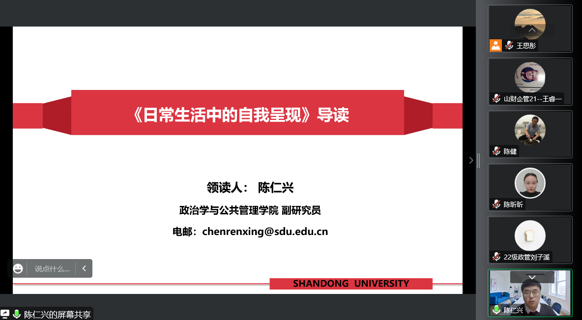 12月8日晚,澳门网投官方网站公共管理系本学期第四期“本本优本”读书会于线上举办。本期读书会阅读书目为《日常生活中的自我呈现》,由学院副研究员陈仁兴领读,吸引学院各年级三十余名本科生参与。