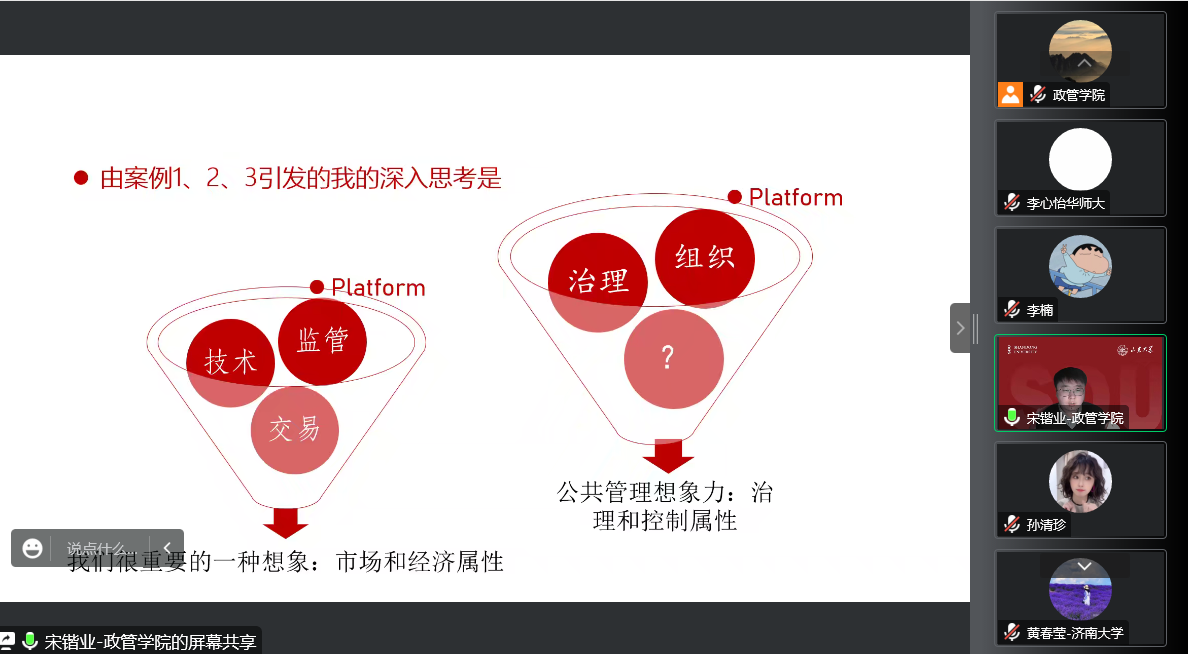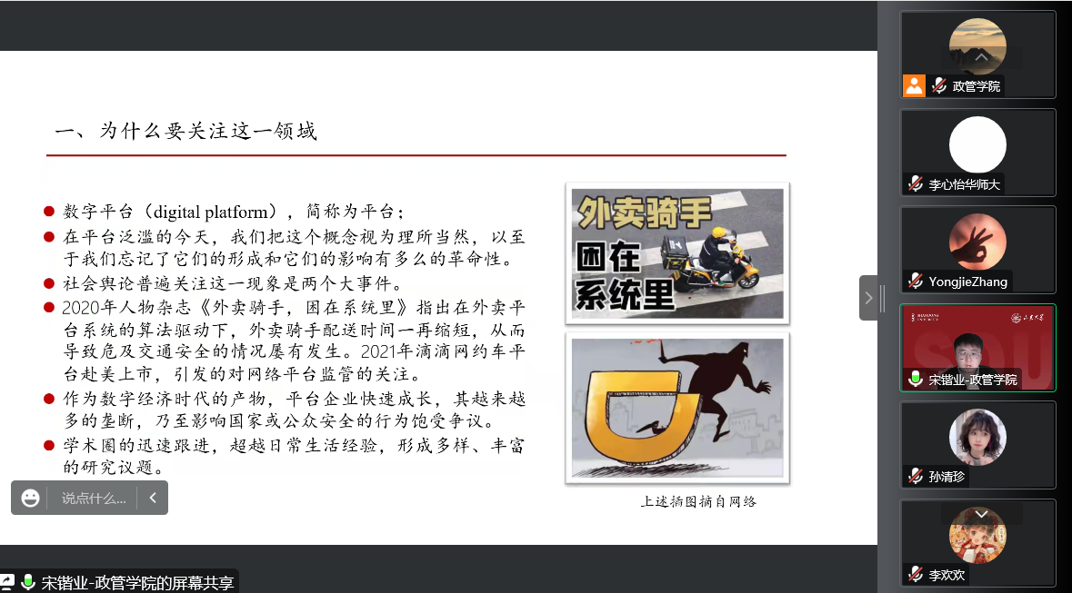 12月15日下午,澳门网投官方网站公共管理系本学期第五期望远青年学者沙龙于线上召开,本场讲座主题为:数字平台与公共管理研究想象。讲座由学院助理研究员宋锴业主讲,学院助理研究员李欢欢担任主持人,一百余名学生积极参与。