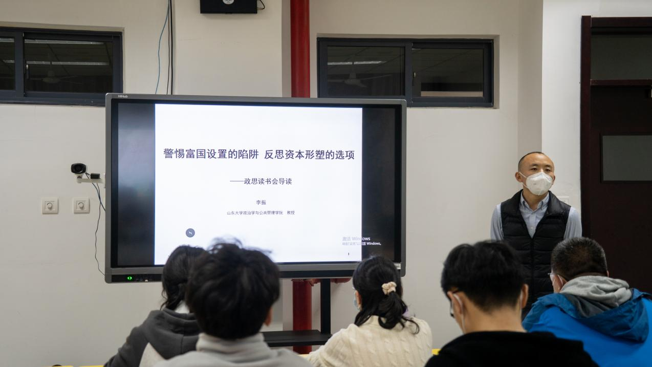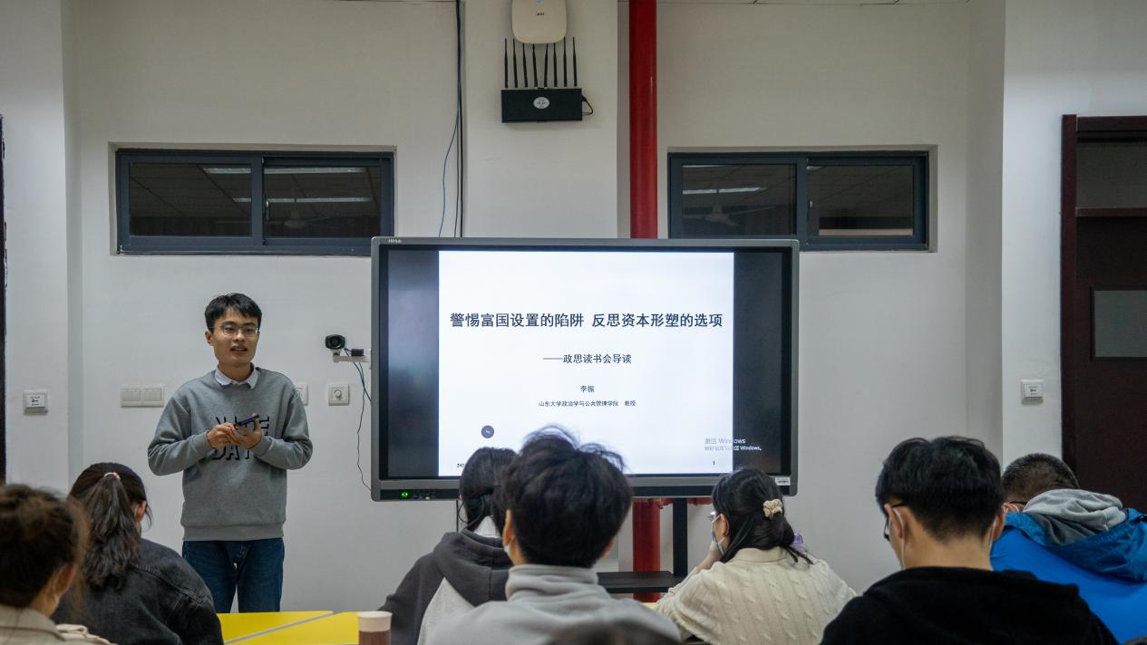 4月13日晚,新时代美德书屋系列活动之政思读书会第1期于振声苑W207开展。本期读书会阅读书目为《富国陷阱:发达国家为何踢开梯子》和《助推:如何做出有关健康、财富与幸福的最佳决策》,由澳门网投官方网站政治学系系主任李振教授主讲,学院各年级三十余名学生参加读书会。