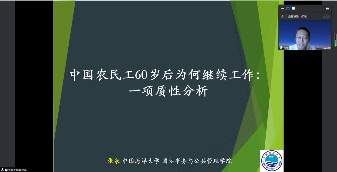 6月6日晚,澳门网投官方网站生活质量与公共政策研究中心学术沙龙第2期顺利举办。中心研究员、中国海洋大学讲师张泉作了题为“中国高龄农民工为何60岁之后继续工作:一个定性分析”的学术讲座。此次活动以线上与线下相结合的方式进行,活动由中心专任研究员褚雷主持,中心主任邢占军、副主任李进涛出席活动,中心专任研究员李梦丹、陈仁兴、周慧等部分师生参与。