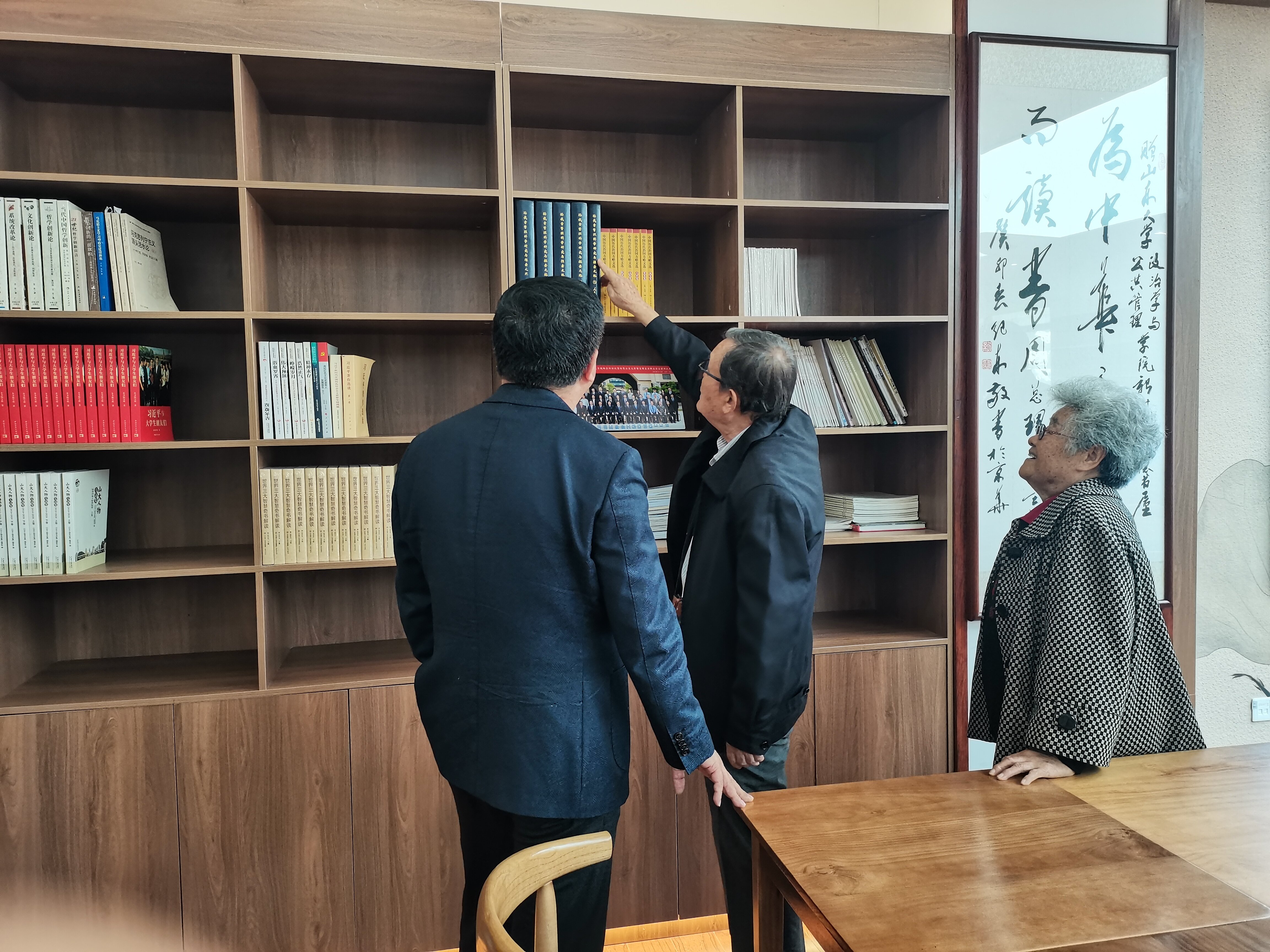 回到学校,孙钱章教授亲切地称呼大家为校友,对于母校的款款深情溢于言表。手抚着书架上其所捐献的《孙钱章管理科学研究与探索之路》和《中国历代治国方略文选》等系列书籍,孙钱章教授介绍了其早年治学的经历以及开创中国管理科学的艰辛历程,真可谓筚路蓝缕、嘉惠学林。随后,孙钱章教授讲述了其积极为国育才的二三往事趣闻,幽默的语言中蕴含着深刻的道理,体现出老山大人对于“为天下储人才,为国家图富强”办学宗旨的不改初心。