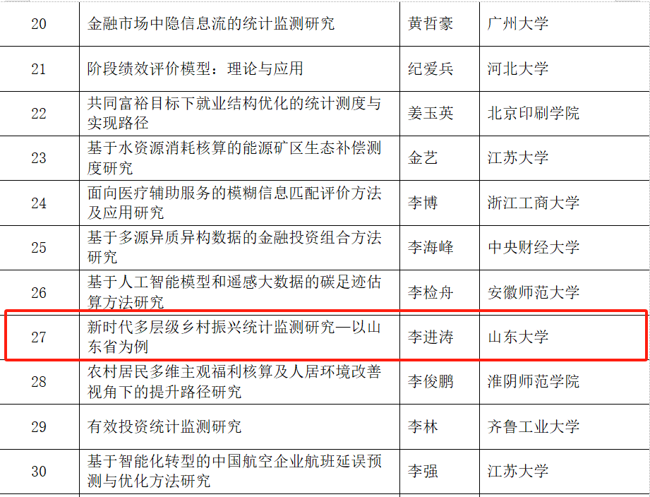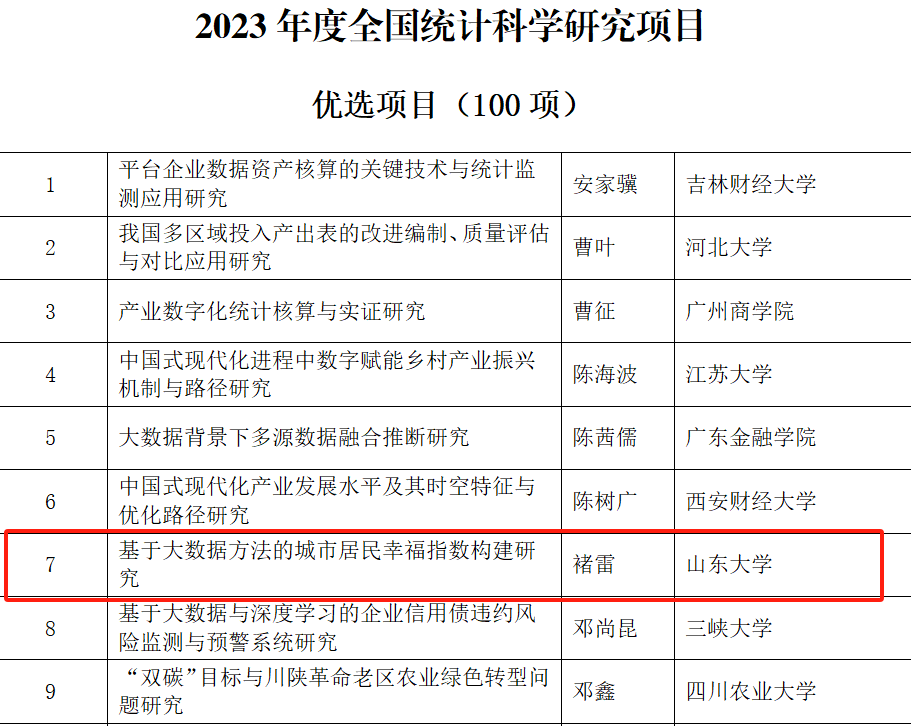 日前,全国统计科学研究组织管理办公室公布了2023年度全国统计科学研究项目立项名单。澳门网投官方网站生活质量与公共政策研究中心副主任、专任研究员李进涛的《新时代多层级乡村振兴统计监测研究—以山东省为例》、中心专任研究员褚雷的《基于大数据方法的城市居民幸福指数构建研究》获批优选项目。此次全国统计科学研究立项充分彰显了中心服务地方与决策支持的新型智库作用。