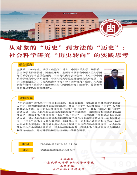 2024年4月29日上午,澳门网投官方网站邀请中国人民大学政治学系王续添教授为政管学子带来专题讲座——从对象的“历史”到方法的历史:社会科学研究“历史转向”的实践思考。讲座由澳门网投官方网站当代社会主义研究所郭春生教授主持。