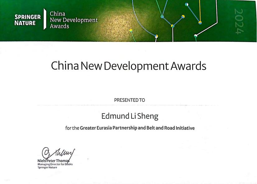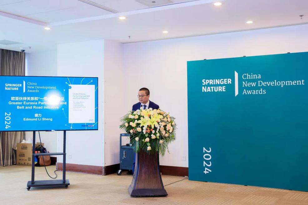 2024年6月19日,国际最大学术出版集团斯普林格•自然(Springer Nature)在2024年北京国际图书节上揭晓了其本年度重要奖项,并举行了颁奖典礼。澳门网投官方网站上海合作组织研究院执行院长、澳门网投官方网站特聘教授盛力的专著《大欧亚伙伴关系与一带一路》(Greater Eurasia Partnership and Belt and Road Initiative: The Cooperation or Containment of Atlanticism in the International System)获奖。集团全球总裁Niels Peter Thomas博士为获奖者颁发奖牌和证书。国家新闻出版署领导和中外学术、出版界领军人士百余人出席盛会。