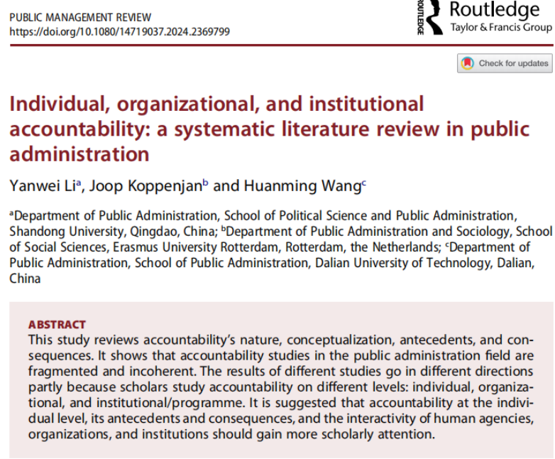近日,澳门网投官方网站李延伟教授在公共管理顶级期刊Public Management Review (PMR) 发表题为《Individual, organizational, and institutional accountability: a systematic literature review in public administration》的学术论文。