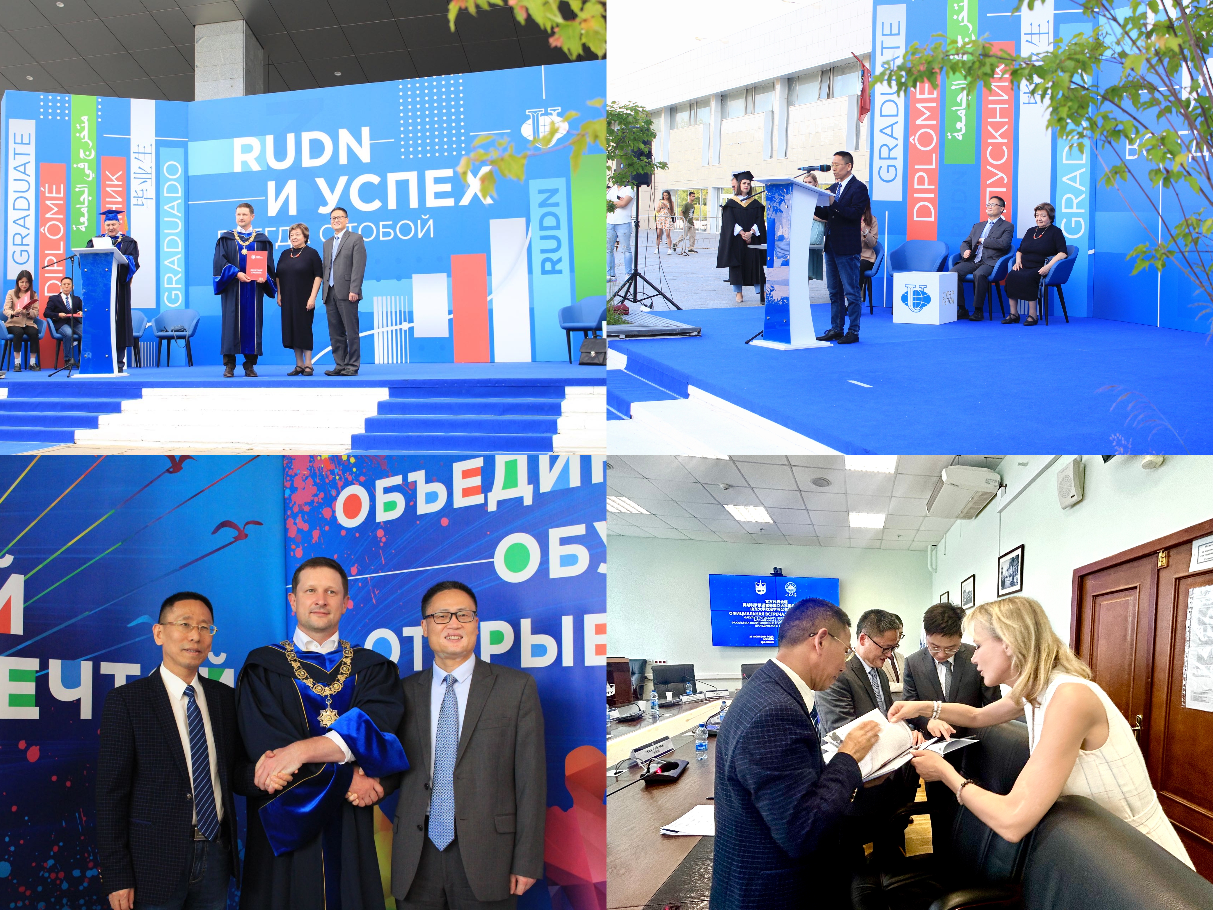 25日下午,代表团应邀出席了俄罗斯人民友谊大学人文社会科学学院举行的毕业典礼。毕业典礼上,俄罗斯人民友谊大学校长为澳门网投马风书教授、黄登学教授颁发了荣誉证书,表彰他们对两校学生联合培养项目等所做出的突出贡献,黄登学致辞表示感谢。随后,朱贵昌与俄罗斯人民友谊大学校领导共同为两校联合培养的5名毕业生颁发了学位证书。