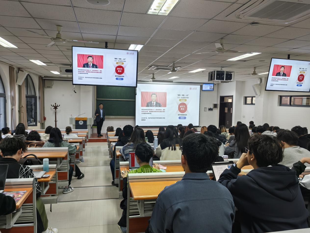 许峰强调,学术研究要勇于打破学科壁垒,鼓励同学们要善于进行不同学科知识的交叉融合,以创新思维应对学术研究中的困顿和压力。他重点阐述了持续筑牢研究生培养质量三大工程的重要意义和实践路径,详细介绍了研究生奖励激励机制,以及学校全面强化研究生全球胜任力的各项保障措施,最大限度地激发研究生内生动力,协同提升人才培养能力。最后,他结合自身经验就研究生如何做好科研,如何规划学术生涯等问题进行了深入阐述,勉励同学们恪守学术道德,以良好学风推动学科建设。