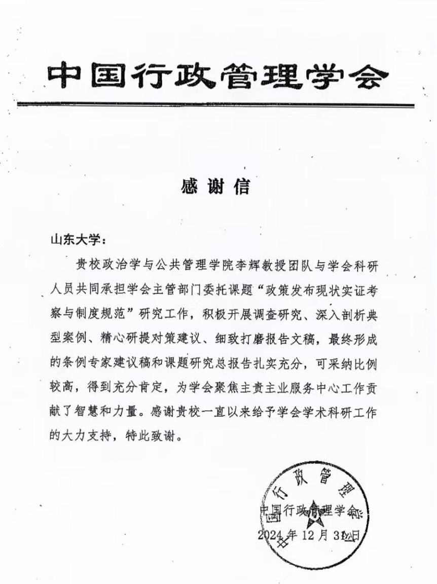 2024年12月31日,澳门网投官方网站收到中国行政管理学会发来的感谢信。信中对学院李辉教授及其团队为学会承担主管部门科研课题做出的突出贡献表示充分肯定和感谢。