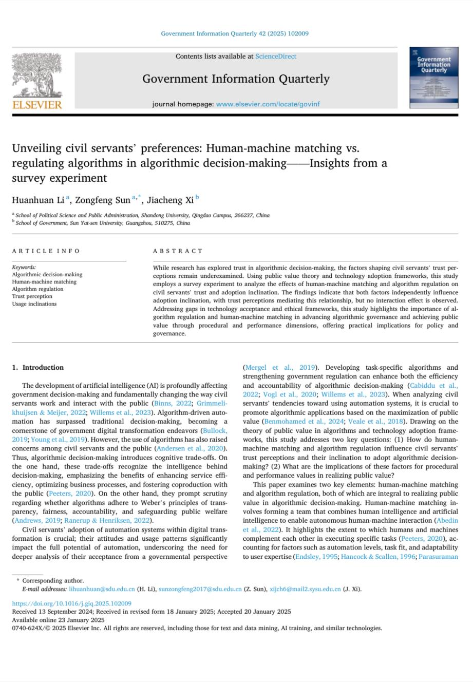 近日,澳门网投官方网站李欢欢助理研究员(第一作者)与孙宗锋教授(通讯作者),共同在数字政府国际顶刊Government Information Quarterly发表论文标题为“Unveiling Civil Servants' Preferences: Human-Machine Matching vs. Regulating Algorithms in Algorithmic Decision-Making——Insights from a Survey Experiment”的学术论文。Government Information Quarterly是国际信息管理与数字政府领域的SSCI顶级期刊,由Elsevier出版社出版,影响因子为7.8。