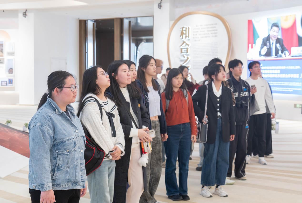 本次活动旨在增强学生对区域合作与国际组织运作的认识,深化课堂所学知识与现实世界的联系。在上合示范区工作人员的引导与讲解下,师生一行首先深入了解了示范区的发展历程、战略定位以及近年来在推动多边经贸合作、促进区域互联互通等方面取得的显著成就。随后,同学们分组前往三大展区,分别体验和探访了来自上合组织成员国的文化展示与地方特色产品。展区通过实物陈列、多媒体展示与沉浸式互动手段,呈现了各国在文化艺术、传统工艺、特色食品、旅游资源等方面的独特魅力。同学们纷纷表示,此次参观不仅加深了对上合国家文化差异与多样性的感知,也激发了他们对区域一体化和跨文化交流的兴趣与思考。