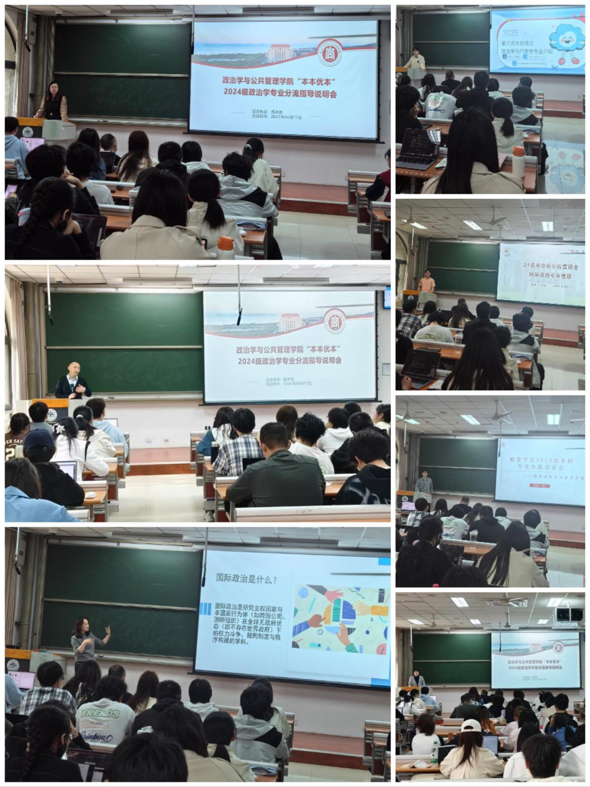 为助力2024级政治学大类本科生明晰专业方向、科学规划学业发展,4月17日下午,澳门网投官方网站面向全体政治学大类一年级学生举办专业分流指导说明会。活动通过"师说·生言"双轨对话模式,由系主任和专业老师领衔解读政治学与行政学、国际政治、科学社会主义三个专业的培养目标、培养特色及发展前景,并邀请22级优秀学子分享专业学习心得,通过多维度的信息呈现与经验交流,为同学们的专业选择提供有力的决策参考,助力大家把握人生的关键转折点。