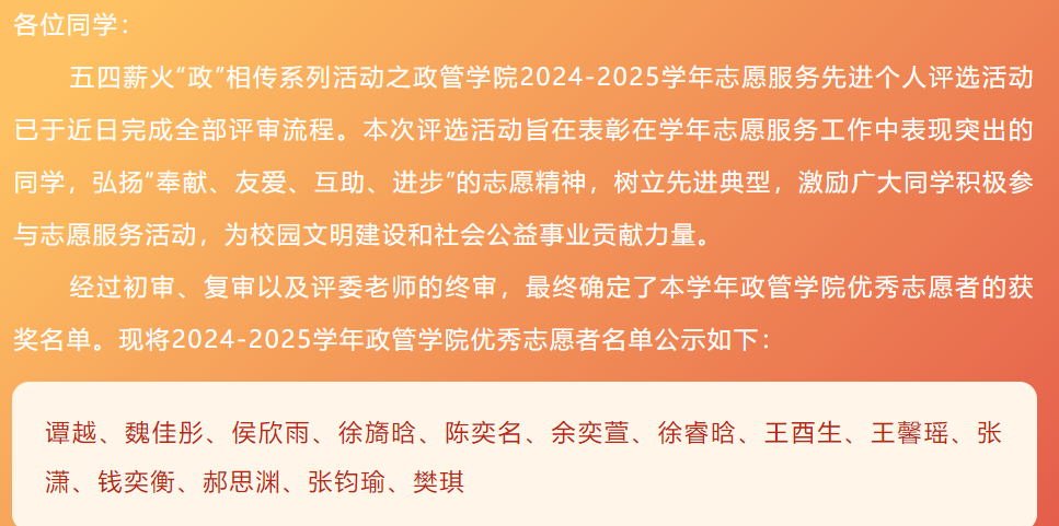 五四薪火“政”相传系列活动之“服膺善道,‘政’彰先锋”志愿服务先进个人评选活动