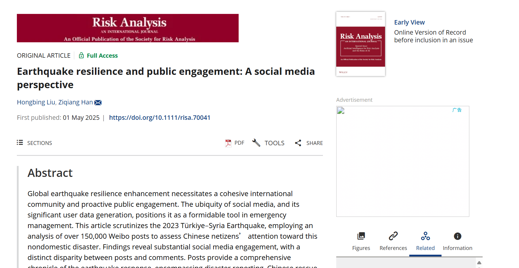 近日,智慧国家治理实验室研究员韩自强教授团队的最新研究成果《Earthquake resilience and public engagement: A social media perspective》在国际期刊Risk Analysis在线发表。Risk Analysis是国际风险分析协会(SRA)的官方期刊,风险管理领域顶级期刊,SSCI 1区、ABS 4级、FMS A类期刊。研究生刘红兵为第一作者,韩自强教授为通讯作者。