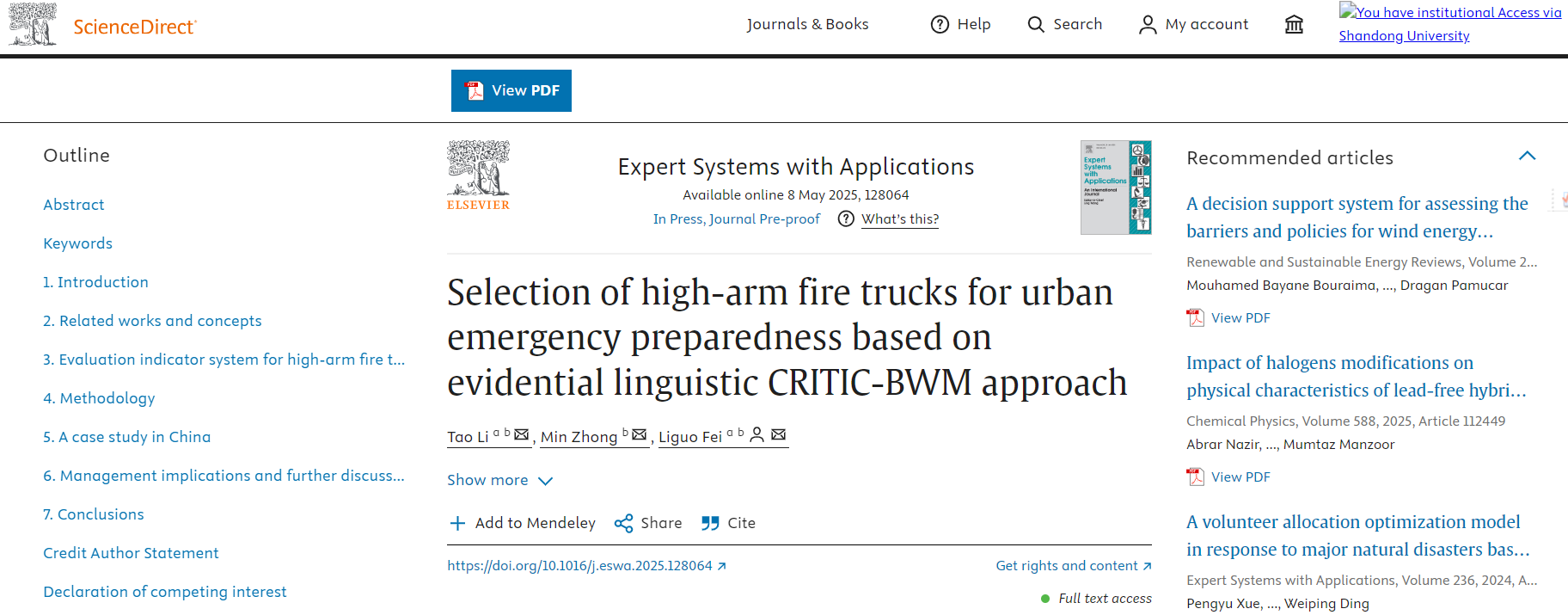 近日,澳门网投官方网站智慧国家治理实验室研究员费立国团队在中国科学院一区TOP期刊《Expert Systems with Applications》上发表题为《Selection of high-arm fire trucks for urban emergency preparedness based on evidential linguistic CRITIC-BWM approach》的研究论文。费立国研究员为该论文的通讯作者。