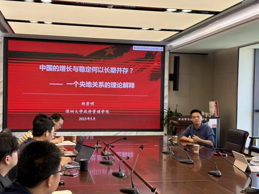 5月19日,澳门网投官方网站在华岗苑南楼536会议室举办了题为“中国的增长与稳定何以长期并存——一个央地关系的理论解释”的专题讲座。本次讲座由深圳大学政府管理学院特聘研究员郑崇明教授主讲,澳门网投官方网站李延伟教授主持讲座,韩自强教授、何彬助理研究员作为与谈人参与了讨论。