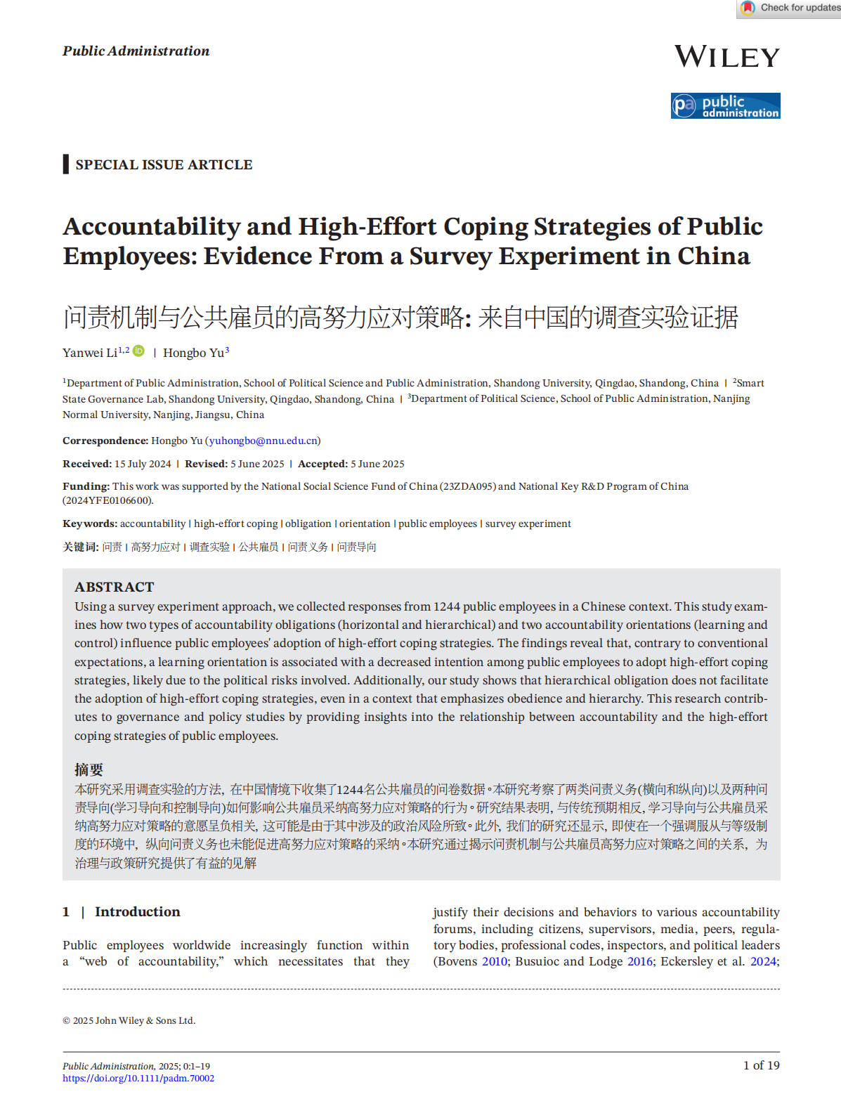 近日,澳门网投官方网站李延伟教授作为第一作者在公共管理顶级期刊Public Administration(PA)在线发表题为《Accountability and High-Effort Coping Strategies of Public Employees: Evidence From a Survey Experiment in China》的学术论文。