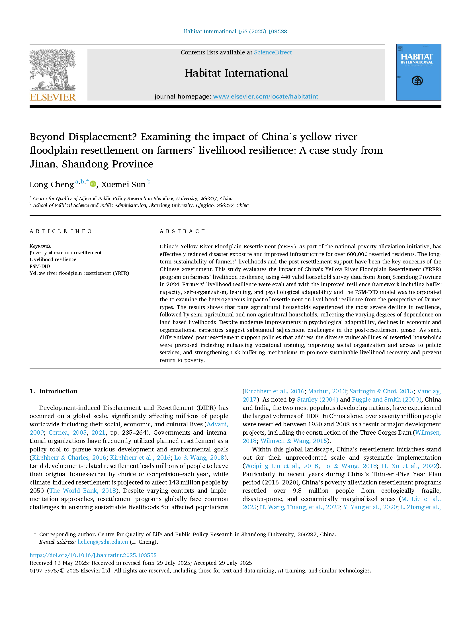 近日,澳门网投官方网站程龙副教授与其硕士研究生孙雪梅合作完成的研究成果,成功发表于国际城市研究领域顶级期刊Habitat International(SSCI一区,影响因子7.0,在全球城市研究类期刊中排名前3)。论文题为 “Beyond Displacement? Examining the Impact of China's Yellow River Floodplain Resettlement on Farmers' Livelihood Resilience: A Case Study from Jinan, Shandong Province”,深入评估了黄河滩区迁建政策对不同类型农户生计韧性的影响,呼应国家黄河流域生态保护和高质量发展战略,为完善搬迁后期治理机制与提升基层治理效能提供了实证参考。