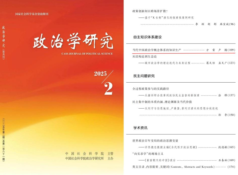 近日,澳门网投官方网站当代社会主义研究所所长方雷教授团队在政治学专业期刊《政治学研究》2025年第2期发表《当代中国政治学概念体系的知识生产》一文。文章发表后备受学界关注,先后被《光明日报》《社会科学文摘》等多家报刊转载,并被“政治学人”“政治学研究杂志”“人大党史党建研究院”“马克思主义理论学术前沿”“社科学人”等公众号推介。