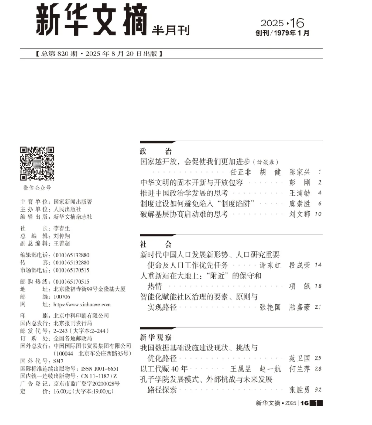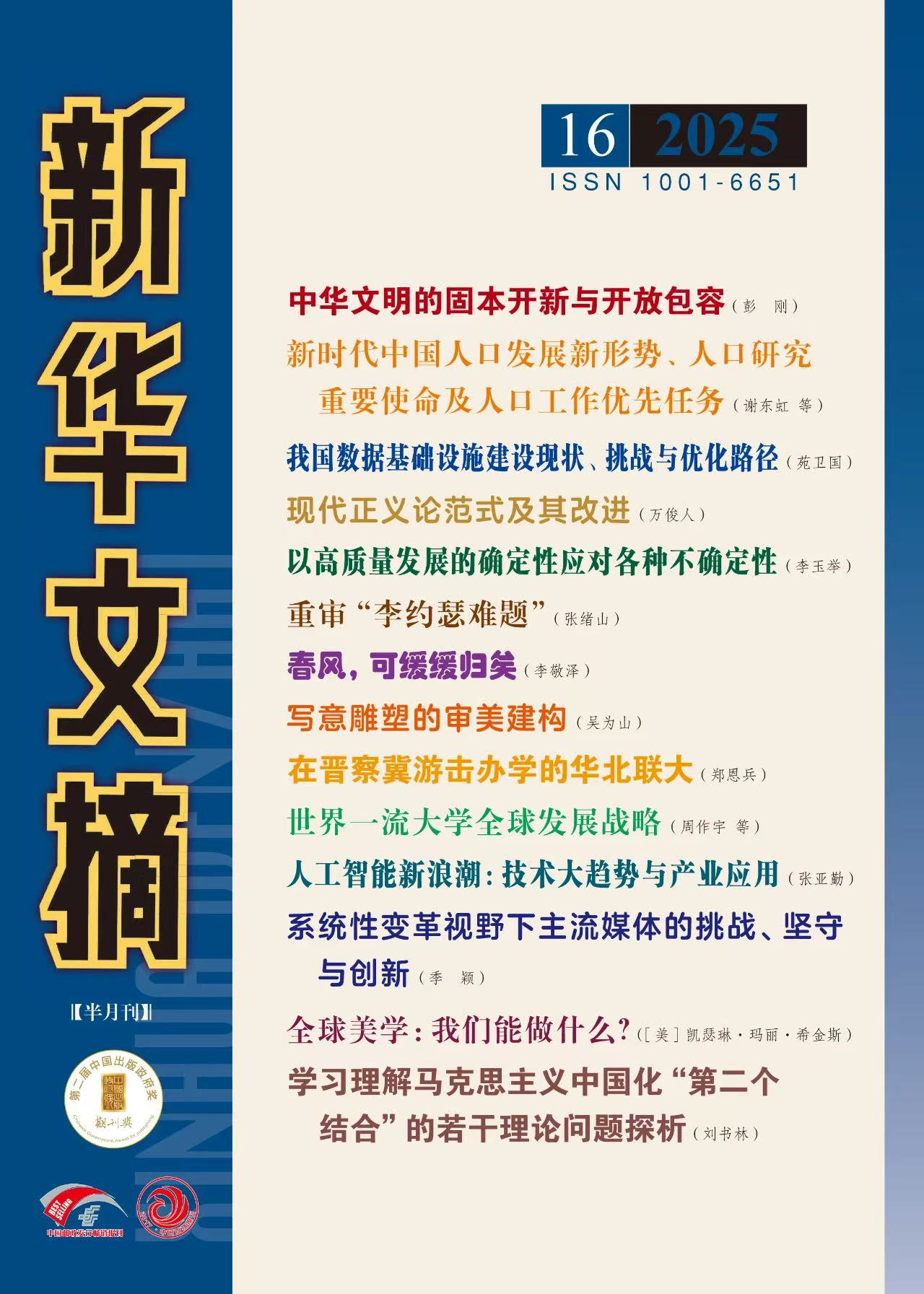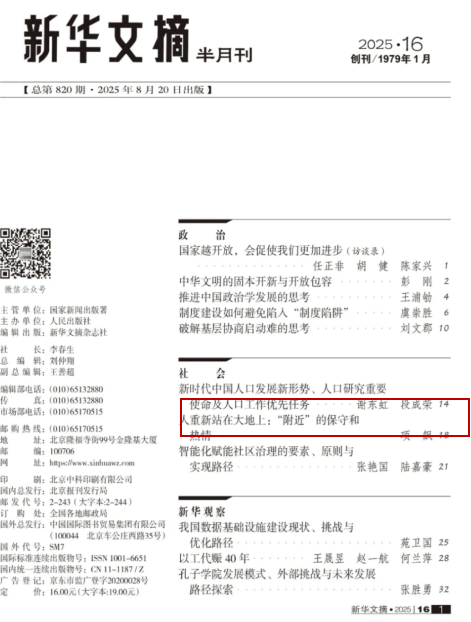 近日,澳门网投官方网站谢东虹助理研究员发表于《人口研究》2025年第2期的《新时代中国人口发展新形势、人口研究重要使命及人口工作优先任务》一文被《新华文摘》2025年第16期作为封面文章全文转载。