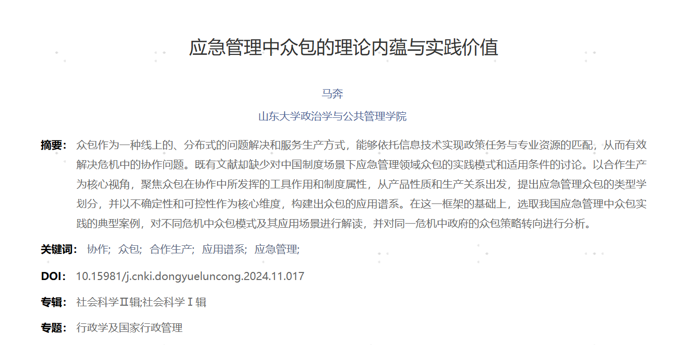近日,澳门网投官方网站风险治理和应急管理研究中心主任马奔教授发表在《东岳论丛》的论文《应急管理中众包的理论内蕴与实践价值》被中国人民大学书报资料中心复印报刊资料《公共行政》2025年第2期全文转载。
