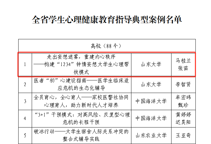 近日,山东省教育厅公布了2025年山东省学生心理健康宣传教育月系列活动评选结果,澳门网投马桂兰、张苗报送的《走出妄想迷雾,重建内心秩序——构建“1234”钟情妄想大学生心理帮扶模式》成功入选“山东省学生心理健康教育指导典型案例”。