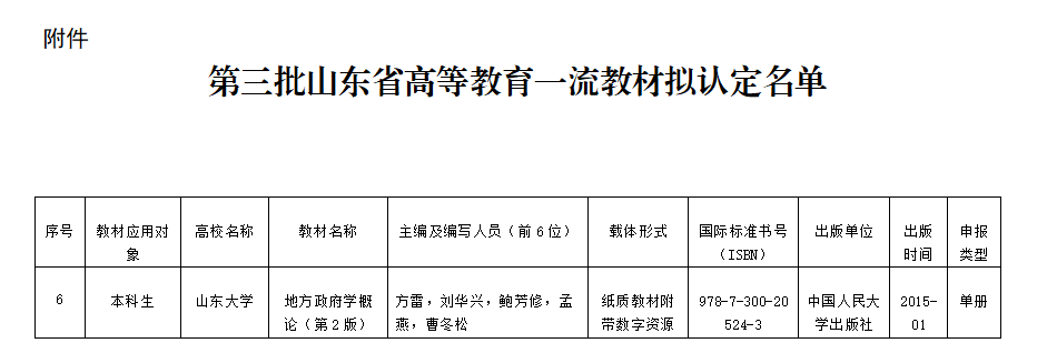 近日,山东省教育厅印发《山东省教材委员会办公室关于公布第三批山东省普通高等教育一流教材名单的通知》(鲁教材委办〔2025〕1 号),经学校推荐、专家评审等环节,澳门网投官方网站方雷教授主编《地方政府学概论(第2版)》教材成功入选。这是继2020年方雷教授主编《当代中国政府与政治》与《政治科学研究方法概论》、王佃利教授主编《现代市政学(第四版)》、滕玉成教授主编《公共部门人力资源管理》、高永贵副教授主编《公文写作与处理》等教材获选山东省高等教育一流教材后,澳门网投在教材建设与教学改革领域获得的又一成果,充分彰显了学院在教材建设方面的扎实成效。