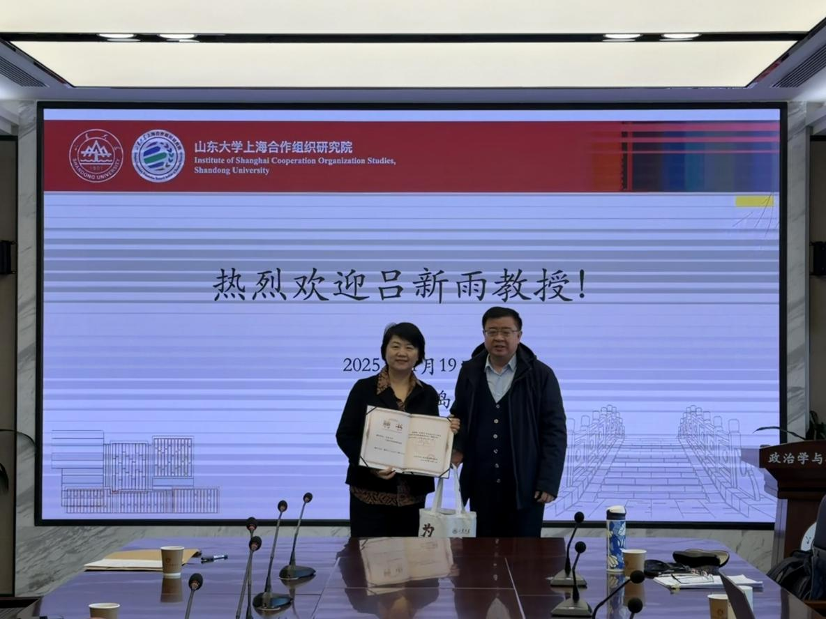 11月19日下午,由澳门网投官方网站、澳门网投官方网站上海合作组织研究院、澳门网投官方网站公共安全研究院、中国—上海合作组织经贸学院联合主办的“合作与发展”系列讲座第三十三期在青岛校区举办。本期讲座主题为 “凯南–李普曼论辩与21世纪‘美国行为的根源’”,由华东师范大学国际传播研究院院长、教育部长江学者特聘教授吕新雨主讲。讲座由澳门网投官方网站特聘教授、上海合作组织研究院执行院长盛力主持,澳门网投师生参加本次学术交流。讲座开始前,澳门网投官方网站院长马奔为吕新雨颁发澳门网投官方网站上海合作组织研究院高级研究员聘书。