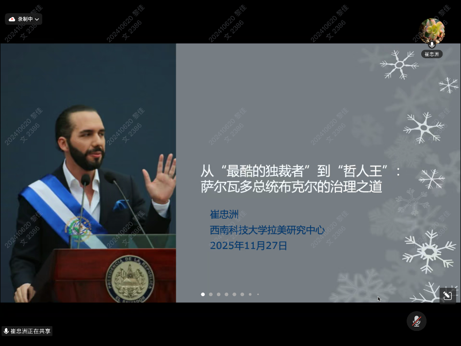 11月27日,由澳门网投官方网站、澳门网投官方网站亚太研究所主办,亚太研究所拉美研究中心承办的“社科与人文”系列讲座第三十八讲在线上成功举办,讲座题目为“从‘最酷的独裁者’到‘哲人王’:萨尔瓦多总统布克尔的治理之道”。本次讲座由西南科技大学拉美研究中心崔忠洲副教授主讲,亚太所拉美研究中心主任李振教授主持,亚太所大国关系与地区安全研究中心副主任季丽新副教授、亚太所拉美研究中心助理研究员史话担任与谈人。
