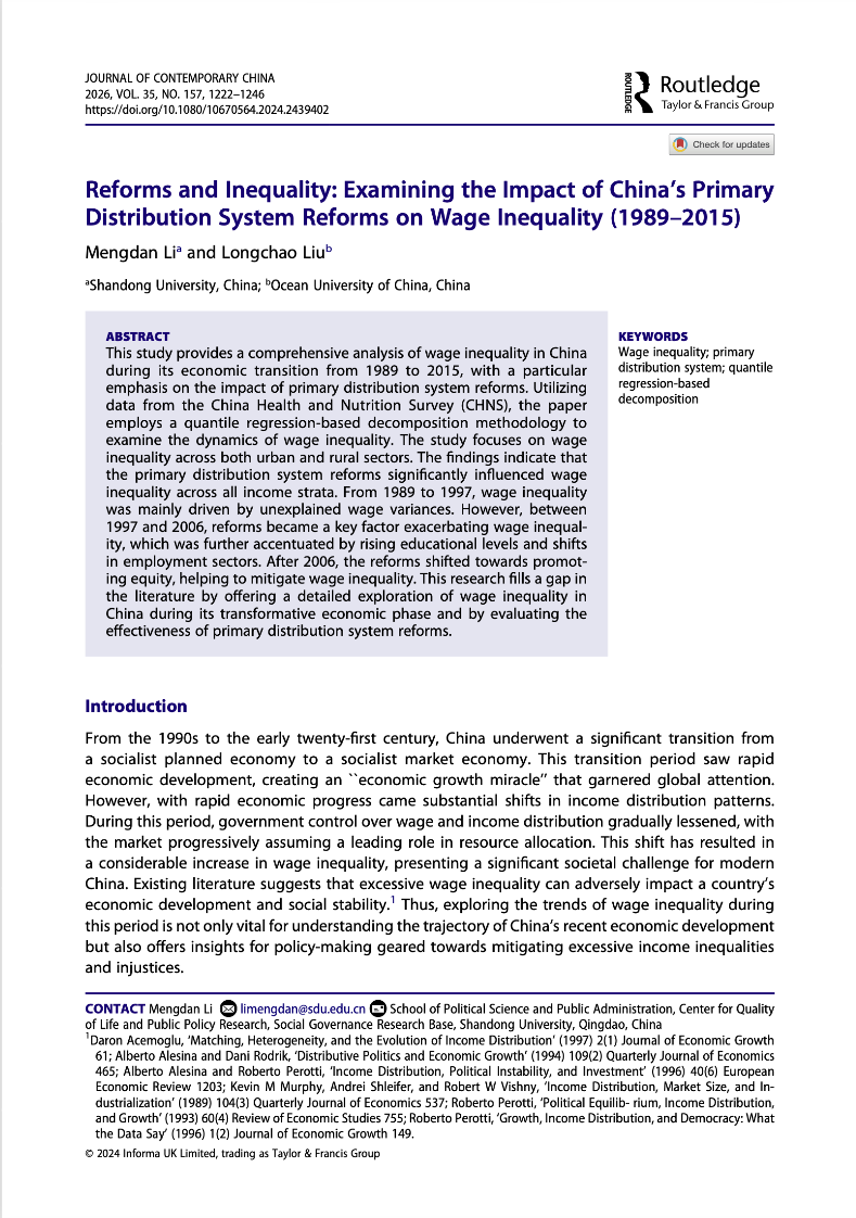 近日,澳门网投李梦丹助理研究员的学术论文 “Reforms and Inequality: Examining the Impact of China’s Primary Distribution System Reforms on Wage Inequality (1989–2015)”(《改革与不平等:中国初次分配制度改革对工资不平等的影响研究(1989–2015)》)在国际顶级学术期刊 Journal of Contemporary China(《当代中国》)上正式刊出(Volume 35, Issue 157),该研究成果得到国家自然科学基金青年项目(72304171,主持人李梦丹)的资助。
