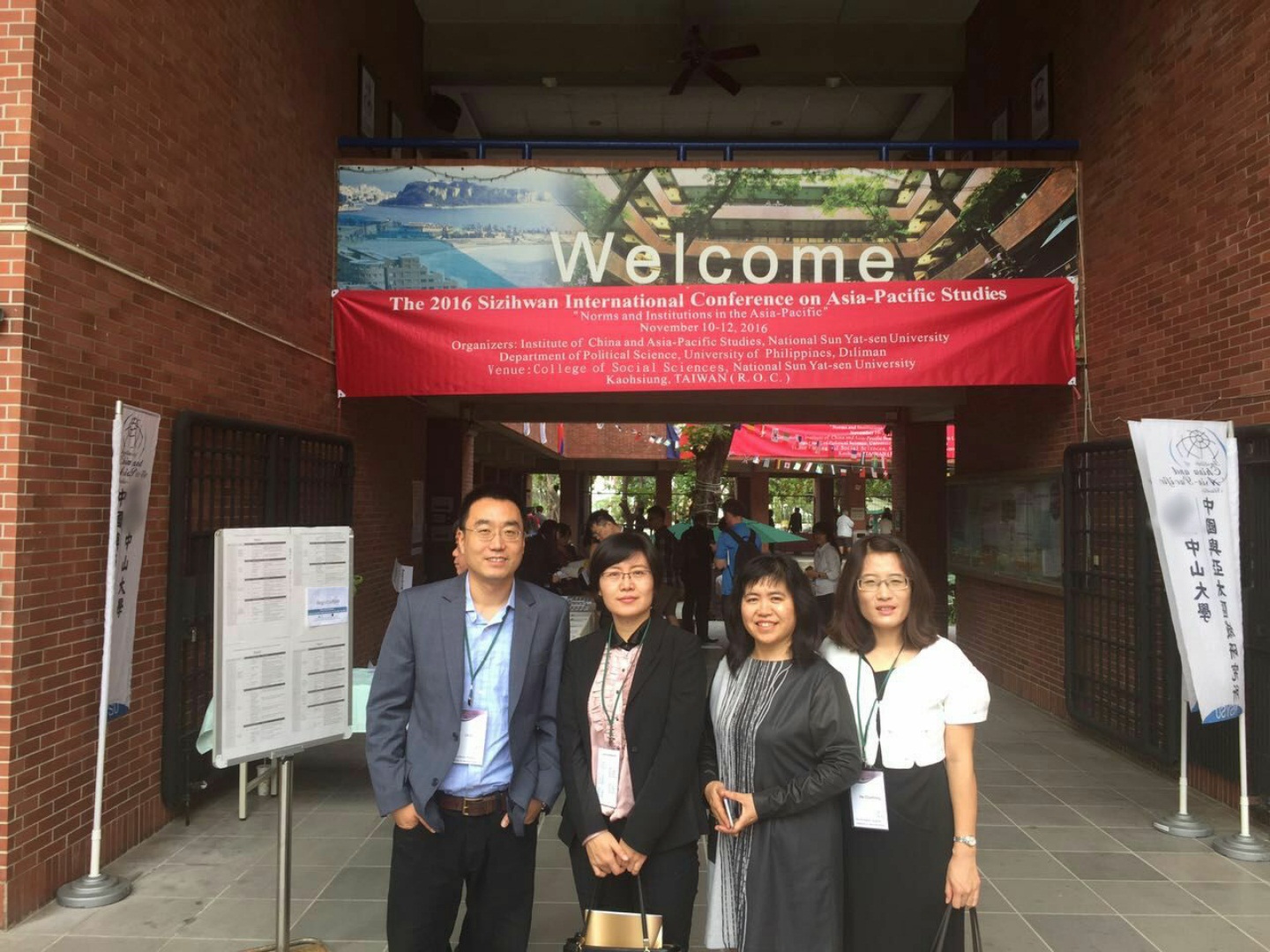 11月10日至12日,应台湾中山大学中国与亚太区域研究所的邀请,澳门网投官方网站亚太研究所的学术代表团的刘琳副教授、王美玲副教授、季丽新副教授、和春红副研究员一行四人参加了2016年台湾中山大学与菲律宾迪里曼大学(University of the Philippines Diliman)共同举办的2016年台湾中山大学西子湾亚太研究国际会议(The 2016 Sizihwan International Conference on Asia-Pacific Studies),本届会议主题为“亚太区域的规范与制度”(Norms and Institutions in the Asia-Pacific)。