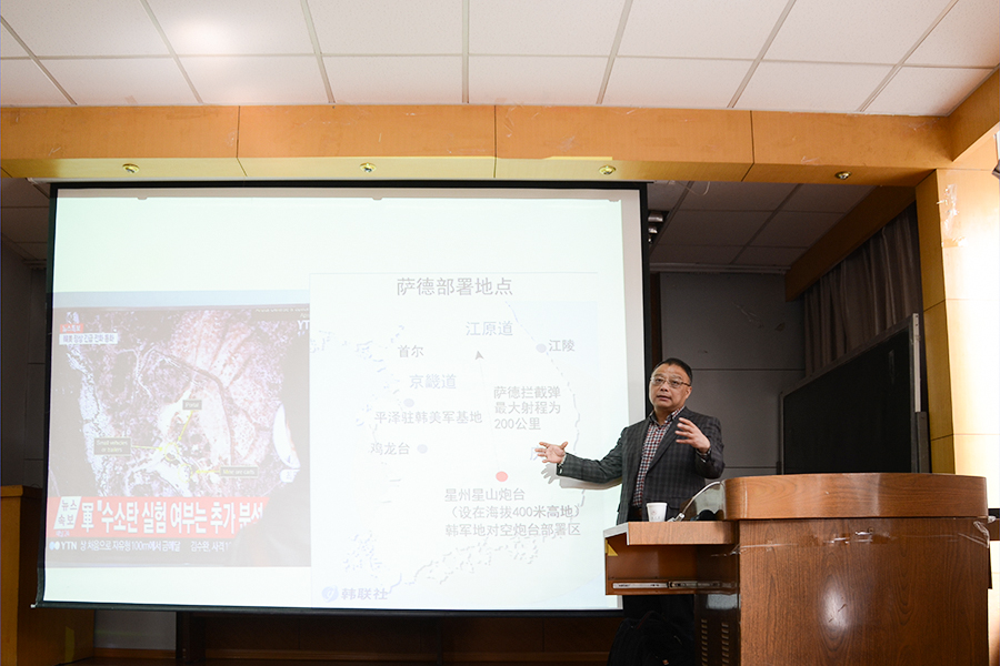 讲座中,朱锋教授首先向我们介绍了朝鲜核试验的最新进展,指出朝核问题正在出现三个方面的新变化,东北亚地区的核威胁正在不断升级,且朝鲜问题“软着陆”的可能性进一步降低。朱锋教授进而引出下一部分内容,即国际社会当前是如何应对朝核问题的,并指出朝核问题并非只是简单的是否发生战争的问题,而是涉及到整个东亚的战略基本态势。在分析完朝核问题与大国冲突的基本理论框架之后,朱锋教授以习特会为切入点,把朝核问题置于中美大国关系的框架下进行深入思考。讲座的最后,朱锋教授在中国如何应对半岛局势方面提出了自己的几点看法,即在“不战、不乱、不核”以及“不失控”的基础之上,中美共同行动,尽快解决朝核问题,以构建安全的东亚地缘环境。整场讲座气氛活跃,朱峰教授深入浅出,用诙谐幽默的语言与生动的举例引得现场笑声不断。在互动环节,朱锋教授认真回答了同学们的提问并就一些观点及概念再次进行了深入交流。